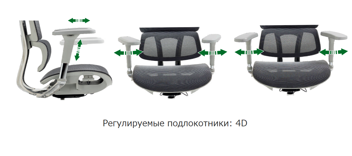 * Сетчатое, черное, многоблочное проводное управление, синхронный механизм, активируемый весом тела, регулируемые: подлокотники 4D, подголовник, поясничная поддержка, глубина сиденья.