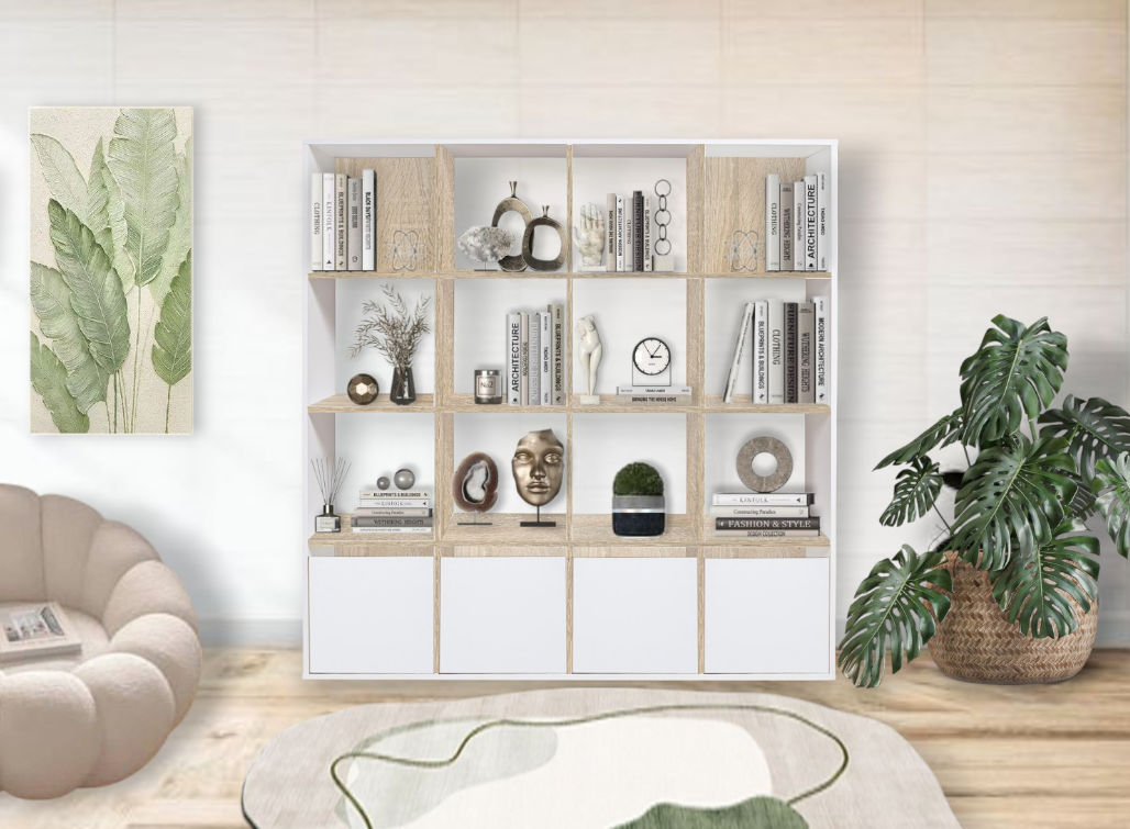 Стеллаж выполнен в современном минималистичном стиле и в актуальном цветовом исполнении.