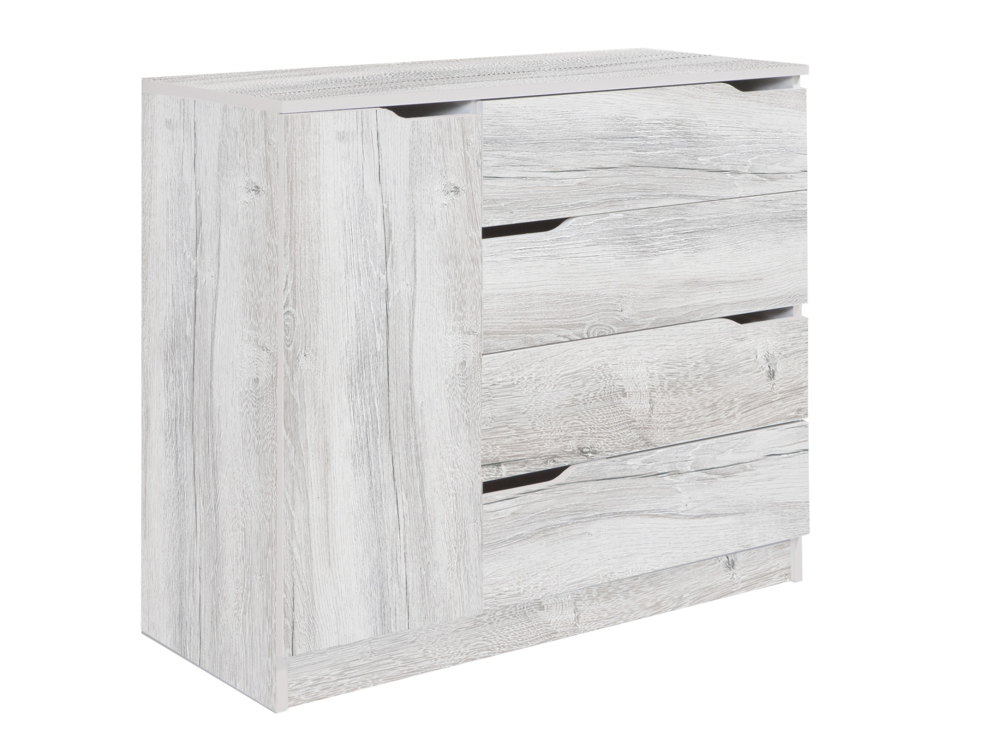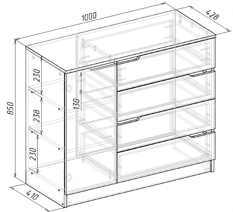 Четыре вместительные выдвижные ящика комода расположены справа, слева - за распашной дверкой отделение с полкой.