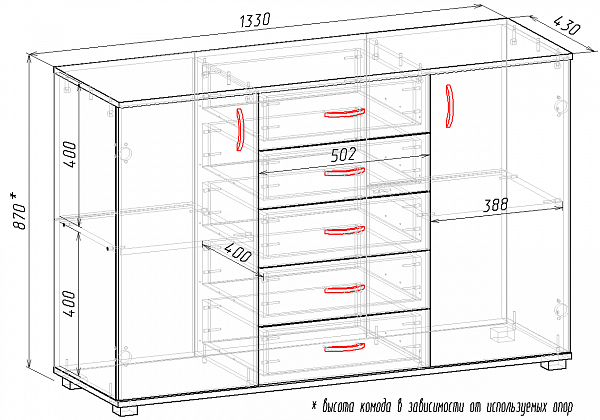 Направляющие: шариковые. Каркас/фасад – ламинированная ДСП, кромка – ПВХ 0,45÷2мм, ручки – металл, опоры – пластик.