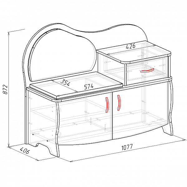 Габариты: ширина 1077 х глубина 406 х высота 872 мм.