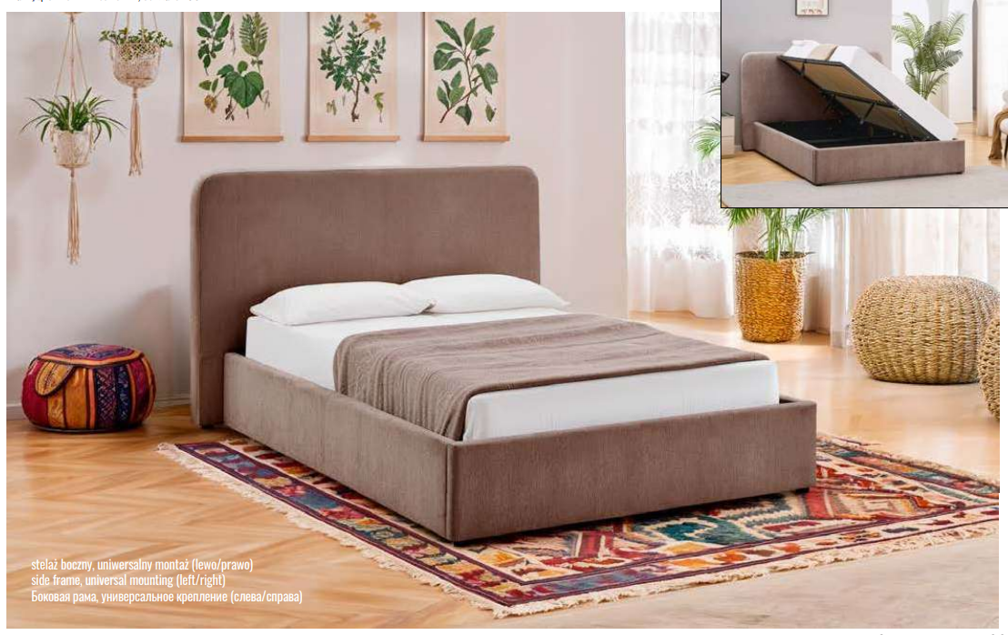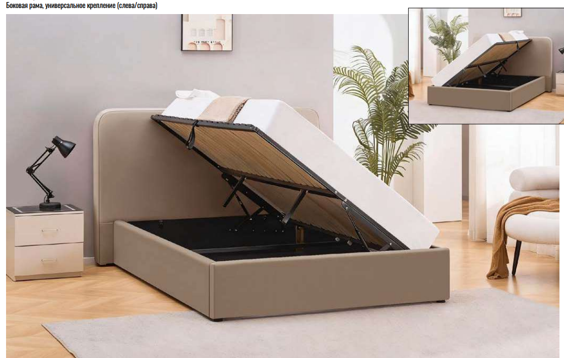 Кровать оборудована подъемным механизмом - газлифт, металлическим ортопедическое основанием и вместительной нишей для хранения.