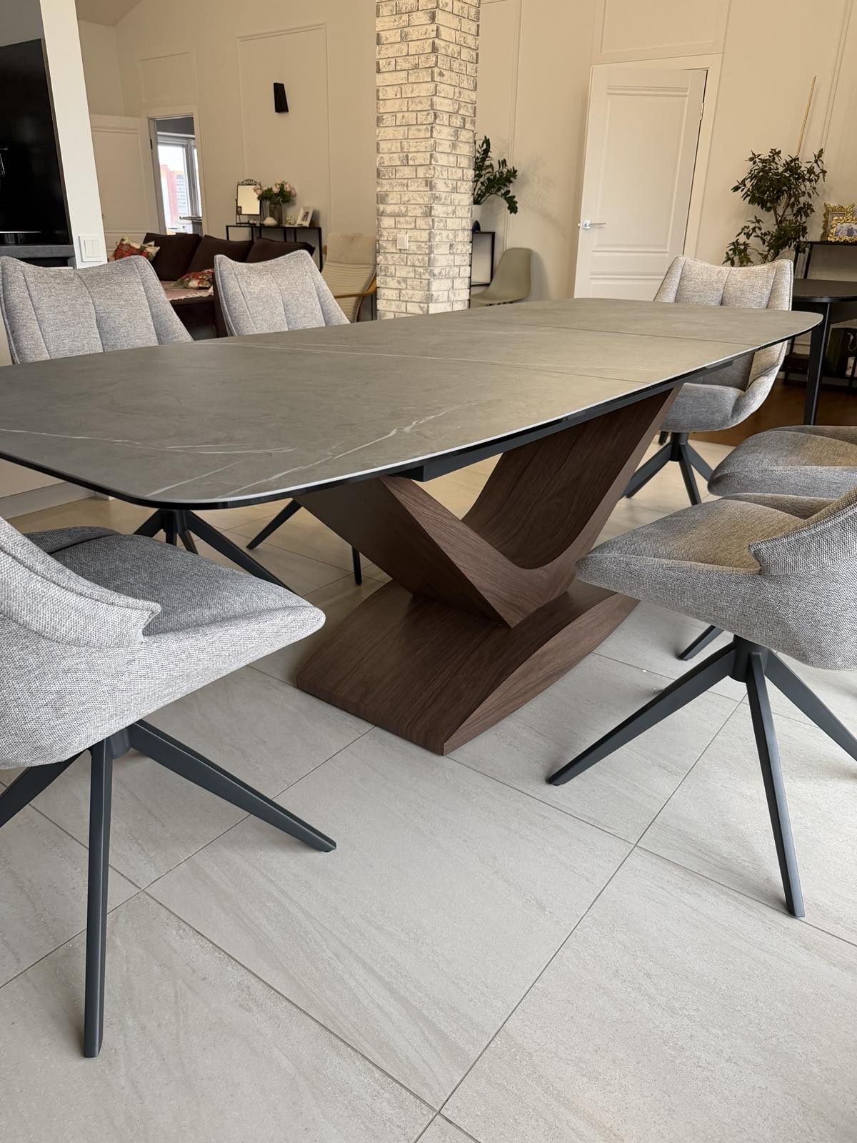 Современный раздвижной стол с керамической столешницей и опорой в цвет дерева Signal DOLCE CERAMIC 95х180/240 серый/орех.