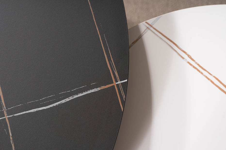* Круглая столешница диаметром 80 см выполнена из белой керамики с мраморным декором, что придает интерьеру престижный вид, а поверхность легко моется и устойчива к повседневному использованию.