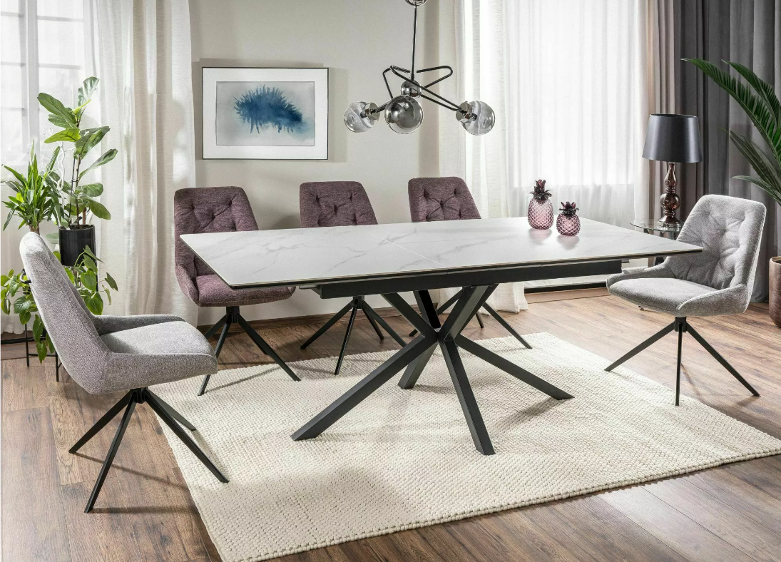 Прямоугольный раздвижной стол. Столешница: МДФ + керамика, цвет матовый белый мраморный.
