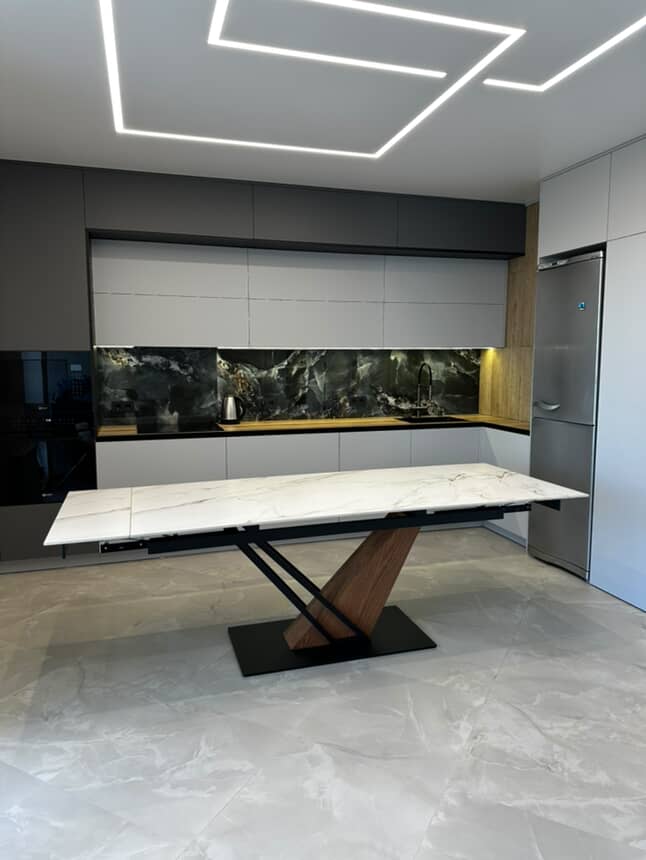 Цвет Белый Цвет белый мраморный / черный+дуб Высота, см 76 Ширина, см 160/220 Глубина, см 90 Каркас металл/мдф+шпон Гарантия 24 месяца Механизм торцевой механизм раздвижения Столешница керамика, эффект мрамора Тип прямоугольный, раздвижной Вес, кг 131 кг Модель прямоугольный, раздвижной Размер 90х160/220 Материал керамика -