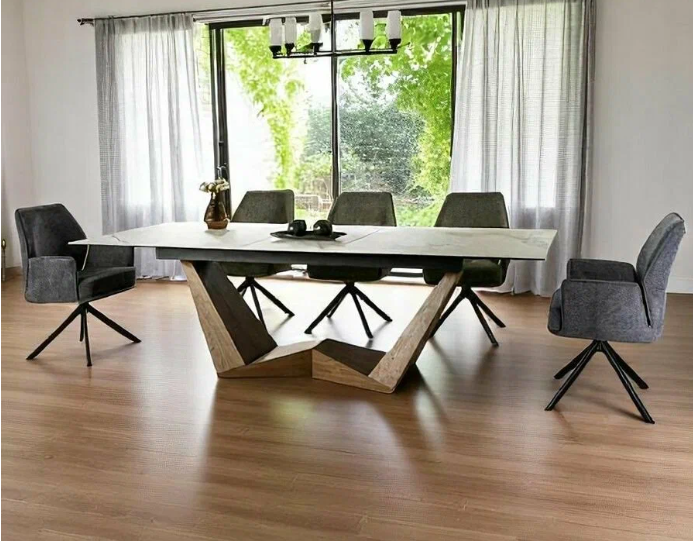 Современный раздвижной стол с керамической столешницей и опорой в цвет дерева
