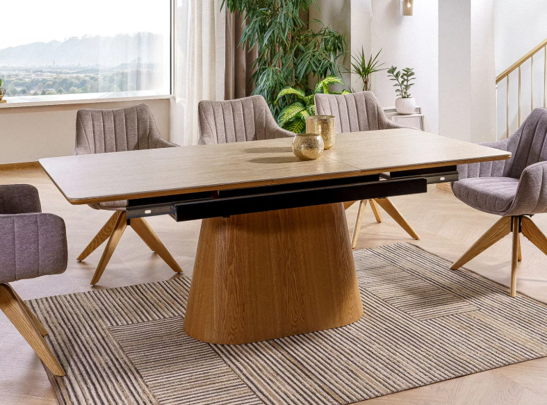 Стол раздвижной, столешница: керамика, каркас: МДФ + натуральный шпон, цвет: травертин бежевый матовый/дуб.