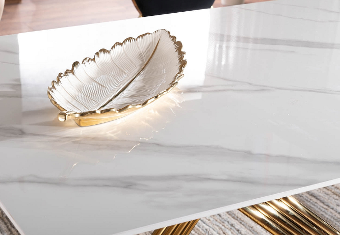 Столешница: керамика, эффект мрамора, каркас: нержавеющая сталь, цвет: белый/золото.