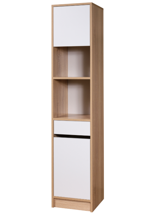 Стеллаж укомплектован выдвижным ящиком и двумя закрытыми секциями с дверями. Нижняя секция разделена полочкой. Также есть открытая ниша, в которой разместятся книги или предметы декора.