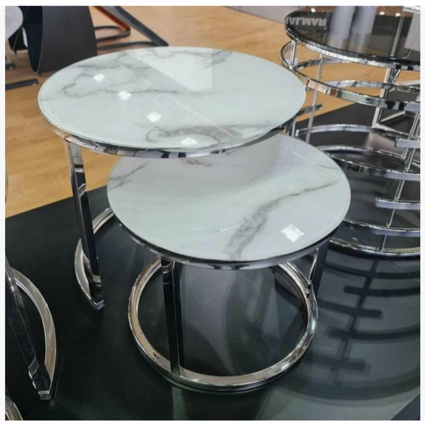 Цвет Белый Цвет эффект белого мрамора/хром Высота, см 45/35 Ширина, см 53/43 Глубина, см 53/43 Каркас металл Гарантия 18 месяцев Дополнительные функции комплект из двух предметов Столешница закаленное стекло с мраморным эффектом Тип круглый Вес, кг 10 кг Материал закаленное стекло -