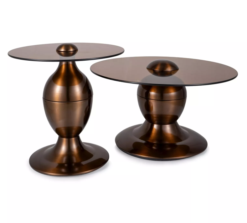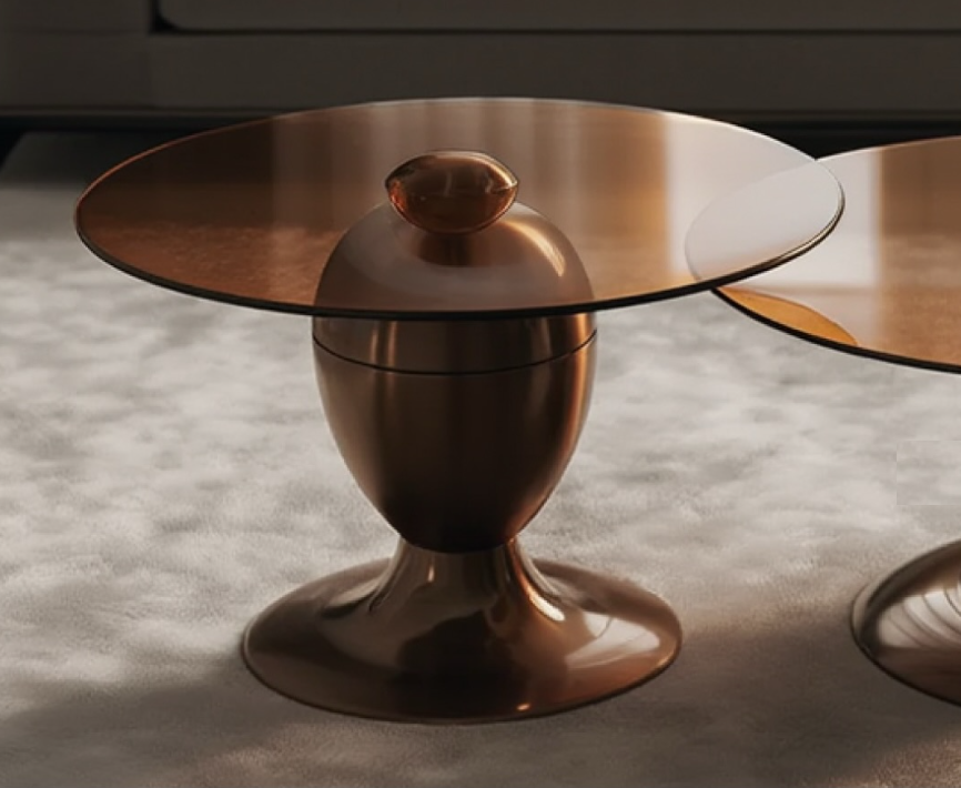 Круглые Столики отличаются неординарным основанием: металлический каркас выполнен в изысканном цвете медный глянец, придающий конструкции визуальной роскоши и стойкости. Верхняя часть представлена круглой столешницей из прочного закаленного стекла диаметром 70 и 50 см, имеющего глубокий прозрачный бронзовый оттенок.