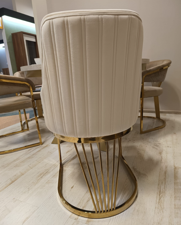 Спинка стула соединяется с каркасом элегантным золотым веером, это придает стулу роскошный вид .