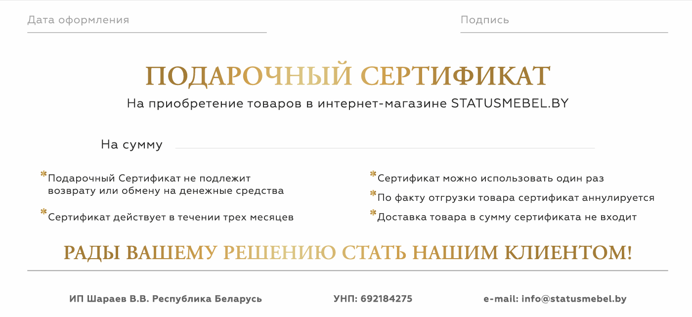 * Для возврата денежных средств на банковскую платежную карточку необходимо заполнить «Заявление о возврате денежных средств» и отправить его по электронному адресу: info@statusmebel.by.